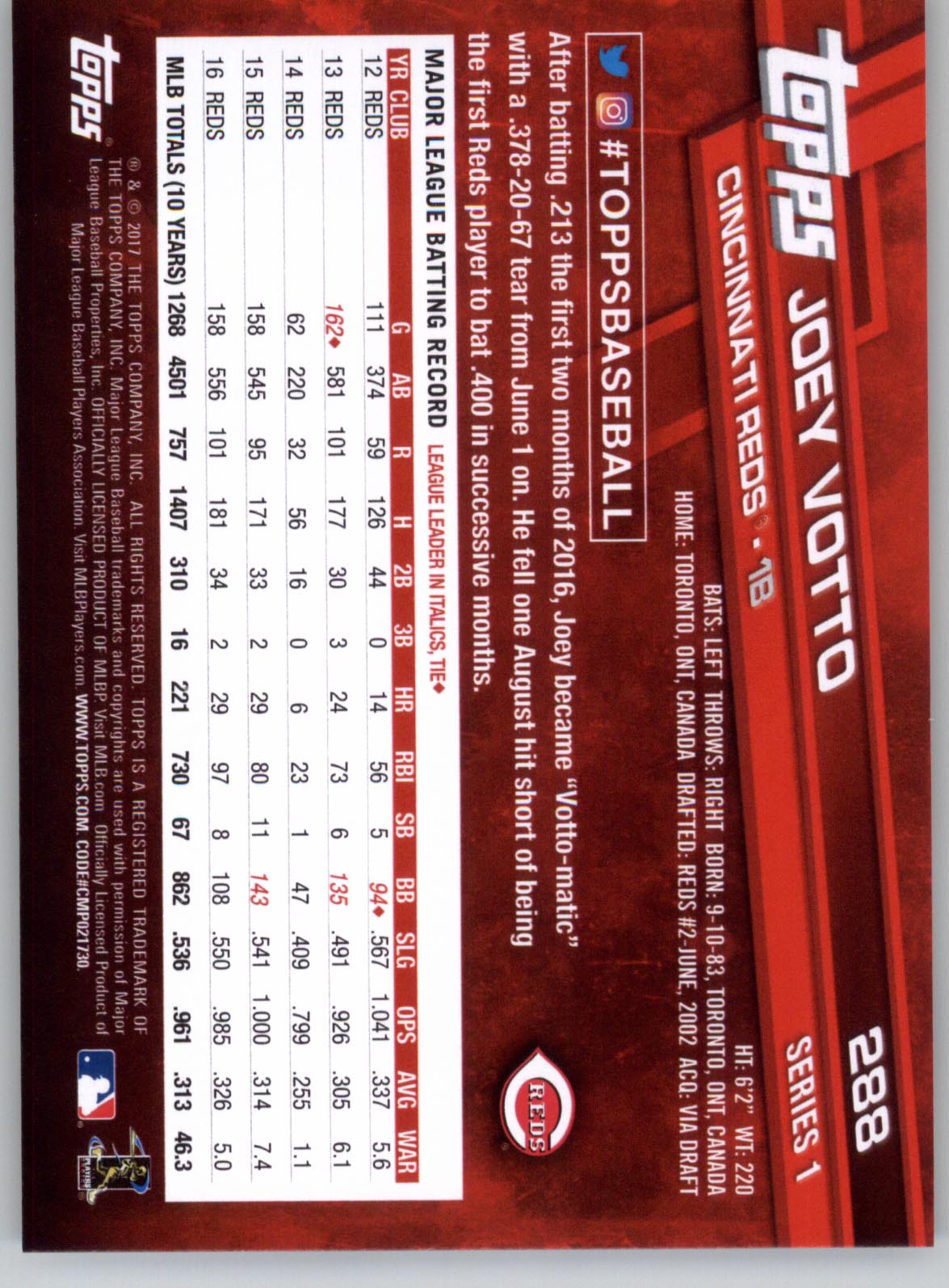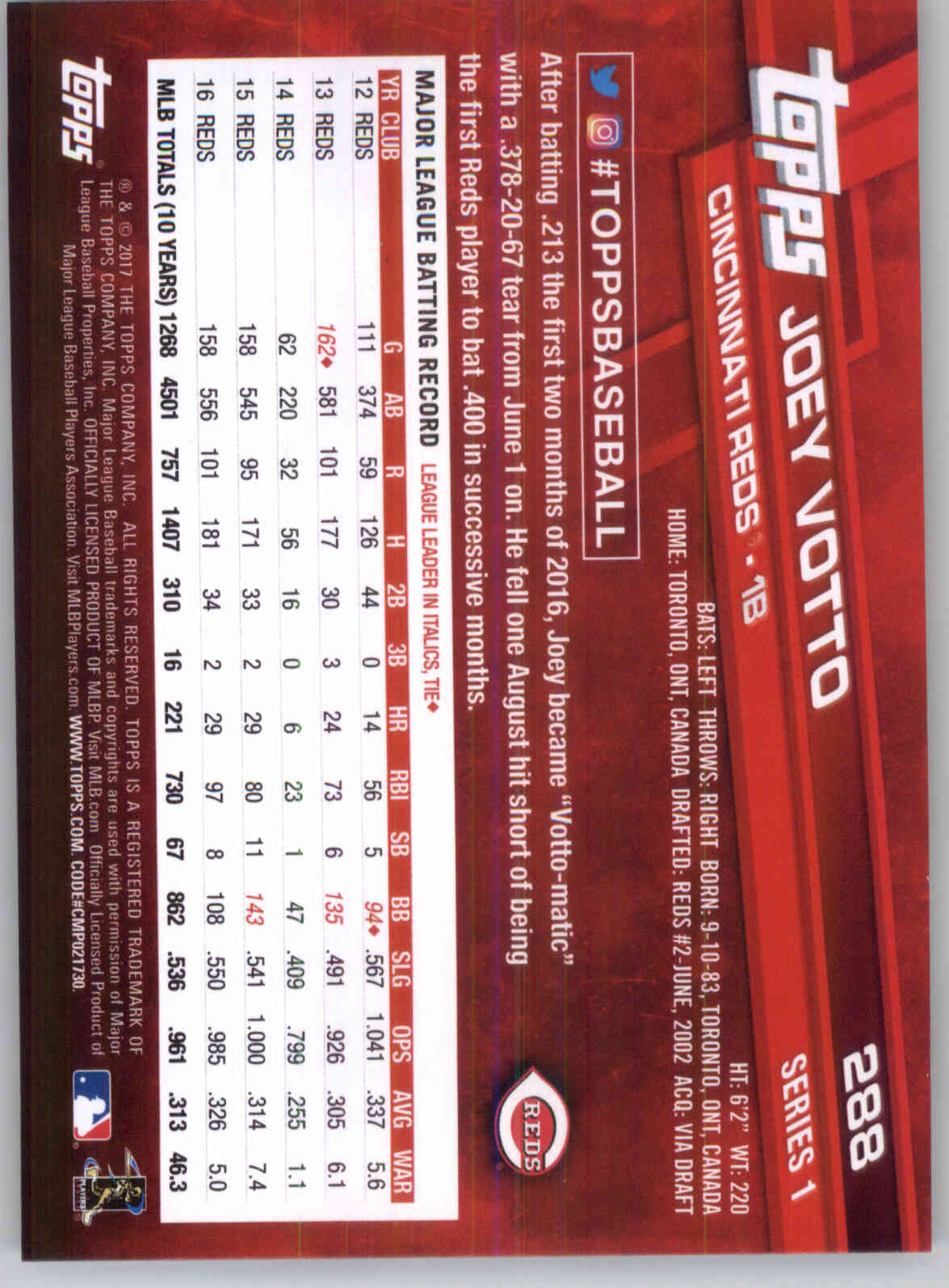 View large back image of 2017 Topps 288 Joey Votto