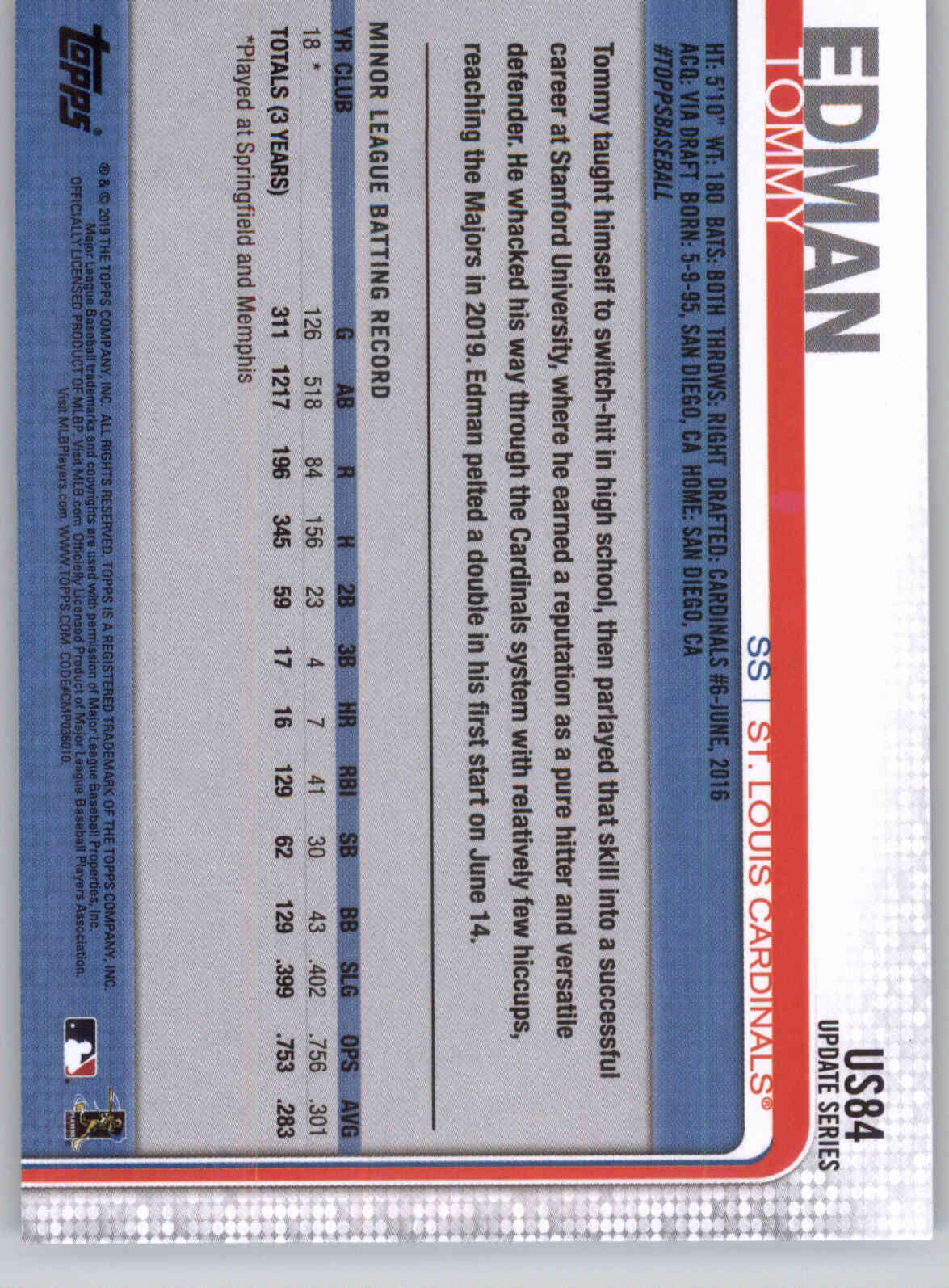 View large back image of 2019 Topps Update 150th Anniversary US84 Tommy Edman